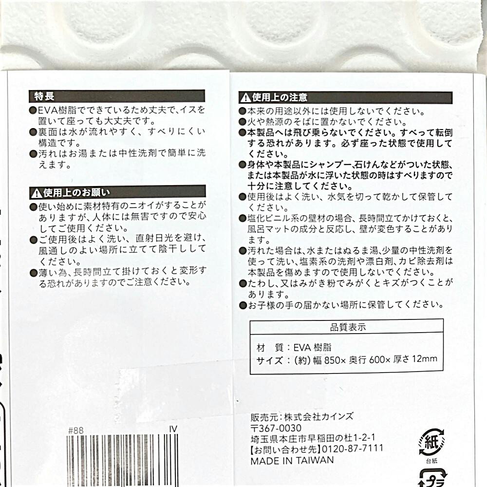 ●EVA樹脂で出来ているため丈夫で、イスを置いて座っても大丈夫です。●裏面は水が流れやすく、すべりにくい構造です。●汚れはお湯または中性洗剤で簡単に洗えます。
