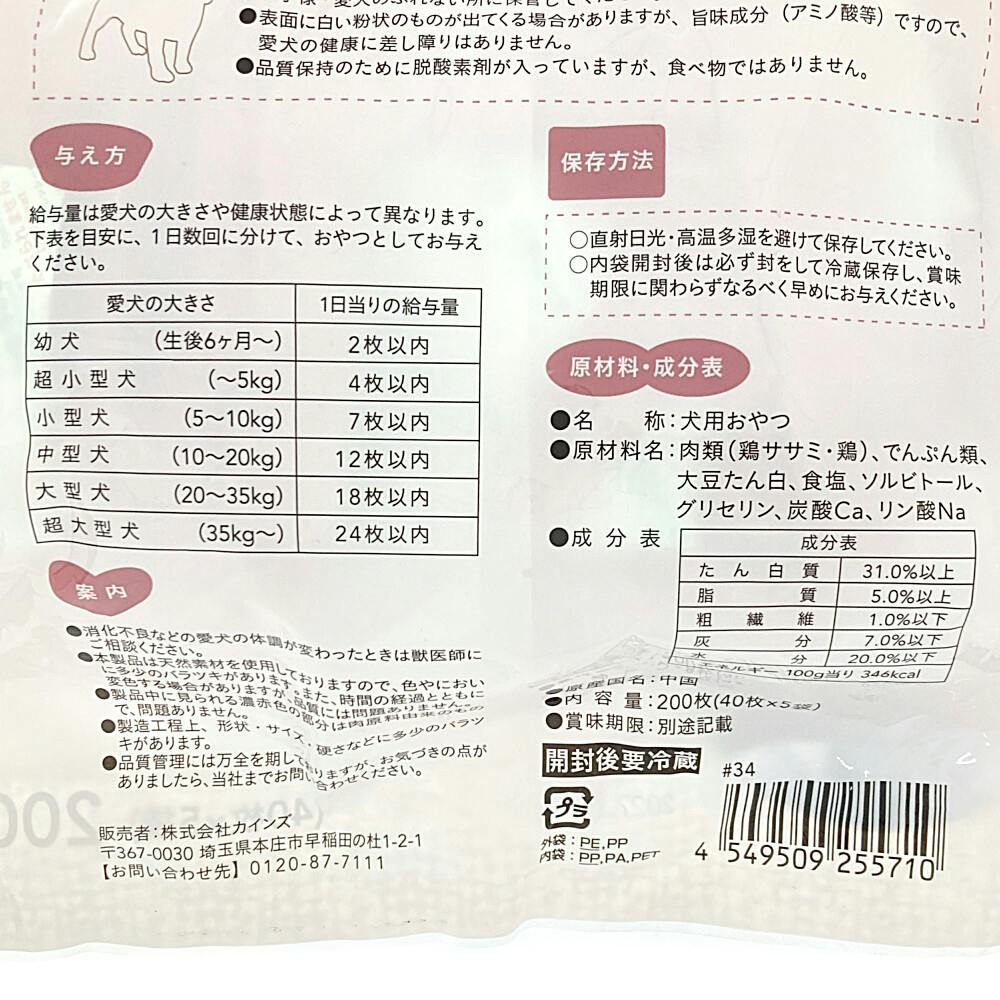 ●1日数回に分けて、おやつとしてお与えください。●1日あたりの給与量/幼犬(生後6ヶ月~):2枚以内、超小型犬(~5kg):4枚以内、小型犬(5~10kg):7枚以内、中型犬(10~20kg):12枚以内、大型犬(20~35kg):18枚以内、超大型犬(35kg~):24枚以内