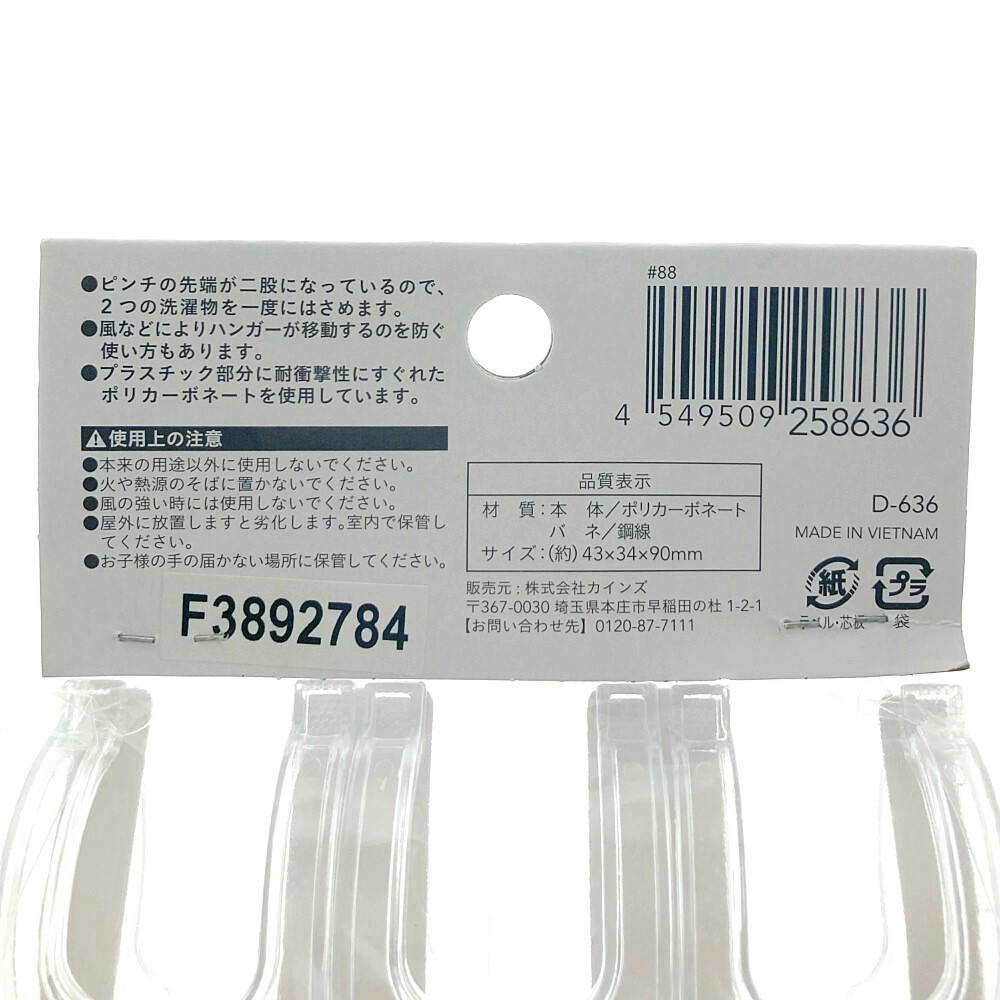 ●ピンチの先端が二股になっているので、2つの洗濯物を一度にはさめます。●風などによりハンガーが移動するのを防ぐ使い方もあります。●プラスチック部分に耐衝撃性にすぐれたポリカーボネートを使用しています。