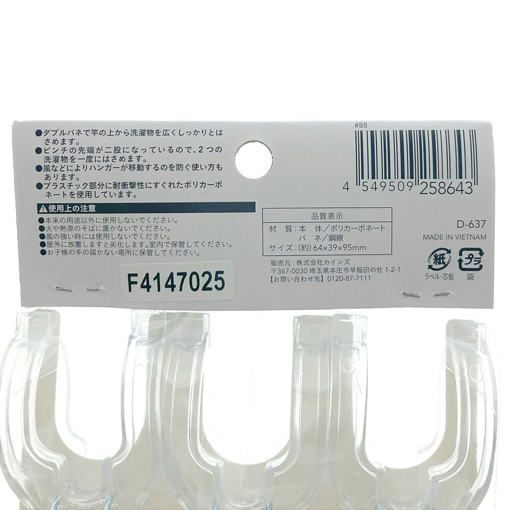 ●2つの強力バネで竿の上から2枚一度にしっかりキャッチ。●ダブルバネで竿の上から洗濯物を広くしっかりとはさめます。●ピンチの先端が二股になっているので、2つの洗濯物を一度にはさめます。