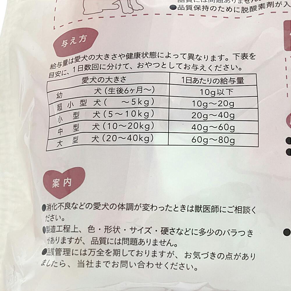 ●本製品は愛犬用おやつです。主食として与えないでください。●6ヶ月未満の幼犬は消化器官が未発達なため、与えないでください。他