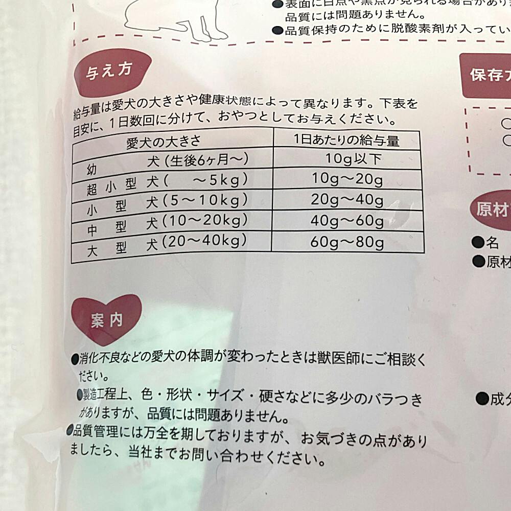 ●本製品は愛犬用おやつです。主食として与えないでください。●6ヶ月未満の幼犬は消化器官が未発達なため、与えないでください。他