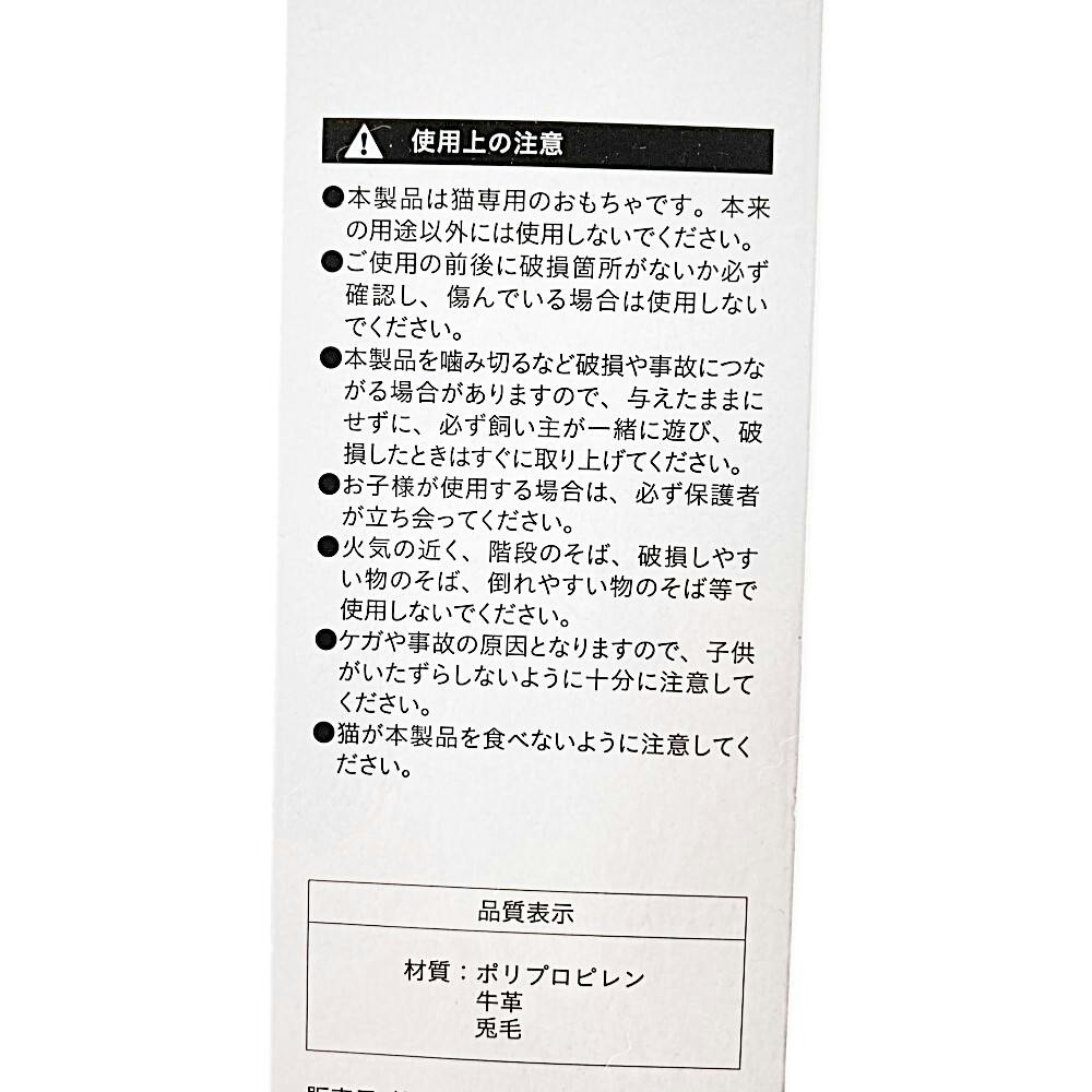 ●猫専用のおもちゃです。用途以外には使用しない●ご使用前後に破損箇所がないか必ず確認し傷んでいる場合は使用しない●本製品を噛み切ると刃損や事故につながる場合があります。与えたままにせず必ず飼い主が一緒に遊び破損した時はすぐに取り上げてください。等