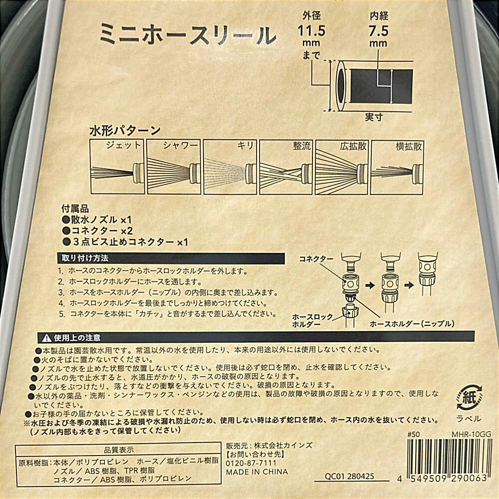 カインズ ミニホース付リール 長さ10m 外径11.5mmまで 内径7.5mm ノズルパターン6種類 軽くて持ちやすい 持ち手付き