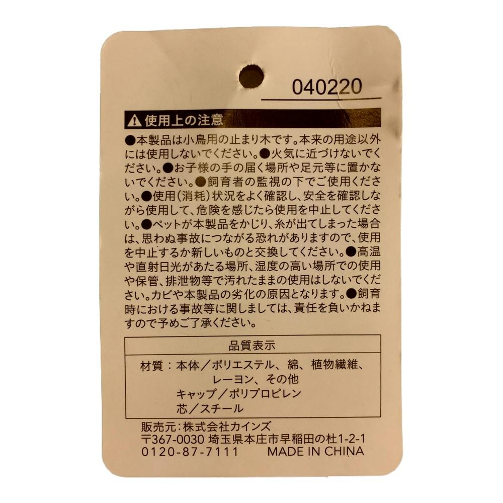 ●本製品は小鳥用の止まり木です。本来の用途以外には使用しないでください。●火気に近づけないでください。●お子様の手の届く場所や足元等に置かないでください。●飼育者の監視の下でご使用ください。等
