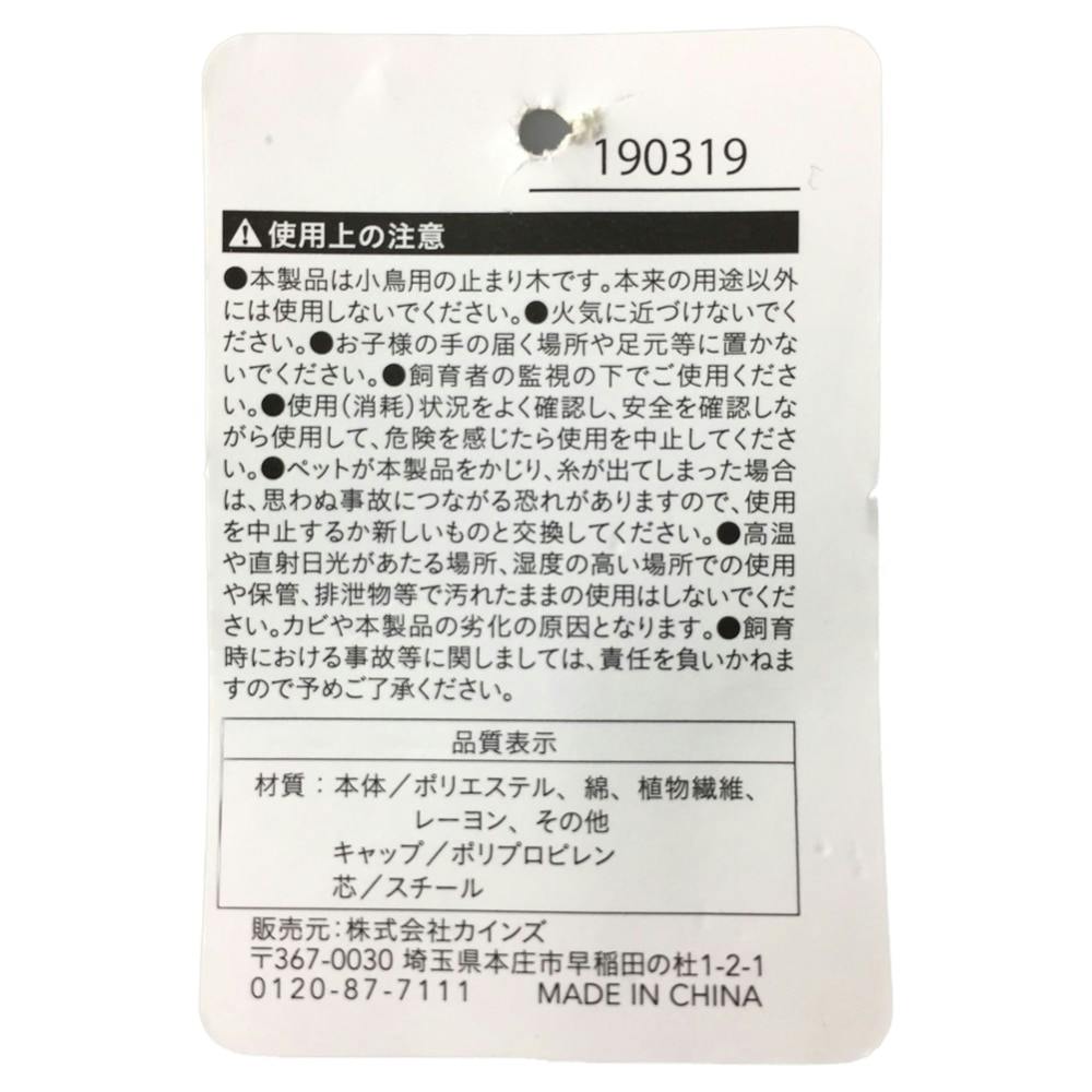 ●本製品は小鳥用の止まり木です。本来の用途以外には使用しないでください。●火気に近づけないでください。●お子様の手の届く場所や足元等に置かないでください。●飼育者の監視の下でご使用ください。等