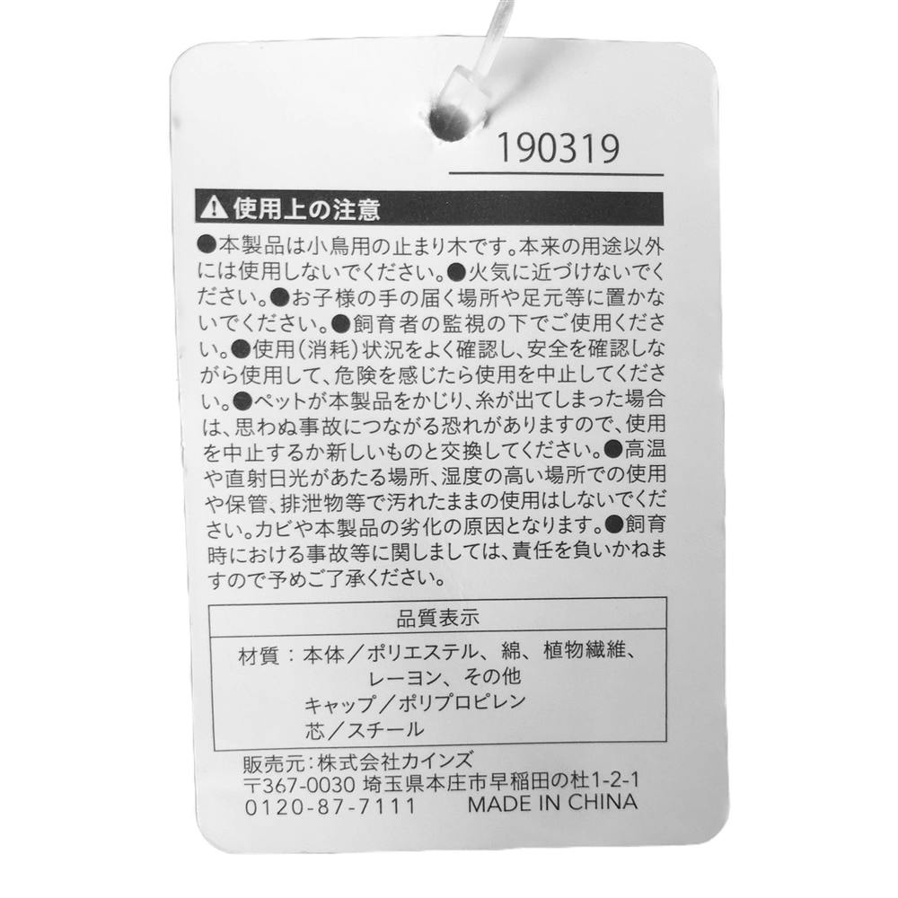 ●本製品は小鳥用の止まり木です。本来の用途以外には使用しないでください。●火気に近づけないでください。●お子様の手の届く場所や足元等に置かないでください。●飼育者の監視の下でご使用ください。等