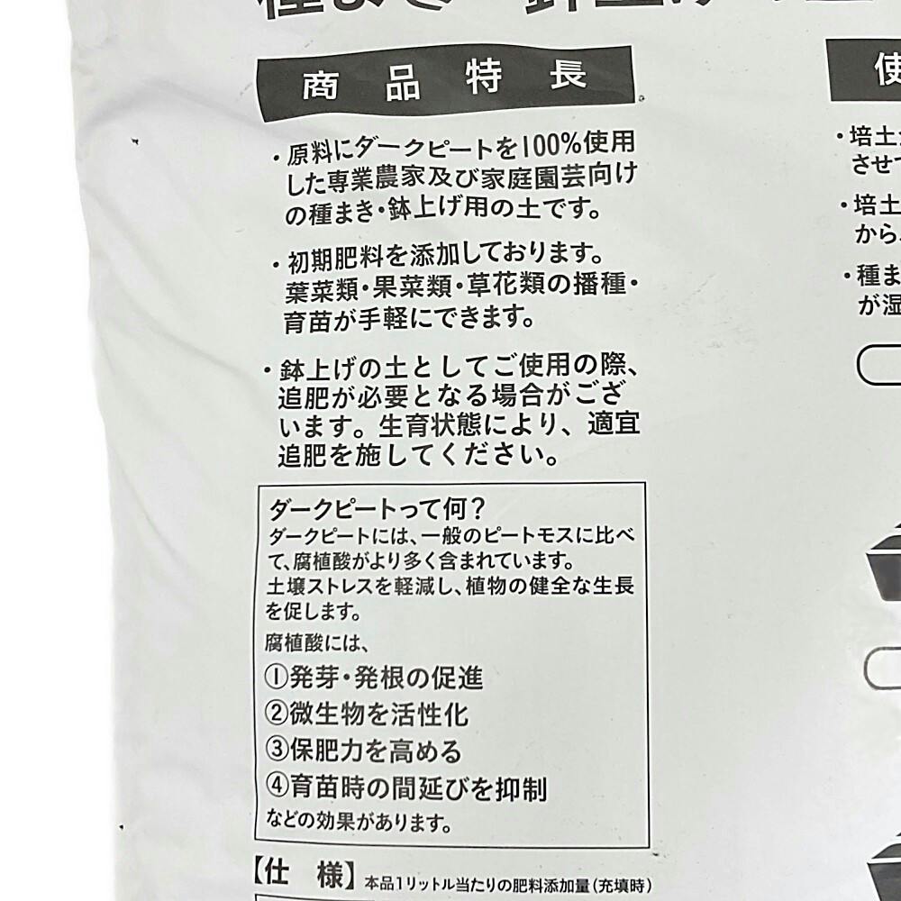 ●原料にダークピートを100%使用した専業農家及び家庭園芸向けの種まき・鉢上げ用の土です。●初期肥料を添加しております。葉菜類・果菜類・草花類の播種・育苗が手軽にできます。●鉢上げの土としてご使用の際、追肥が必要となる場合がございます。