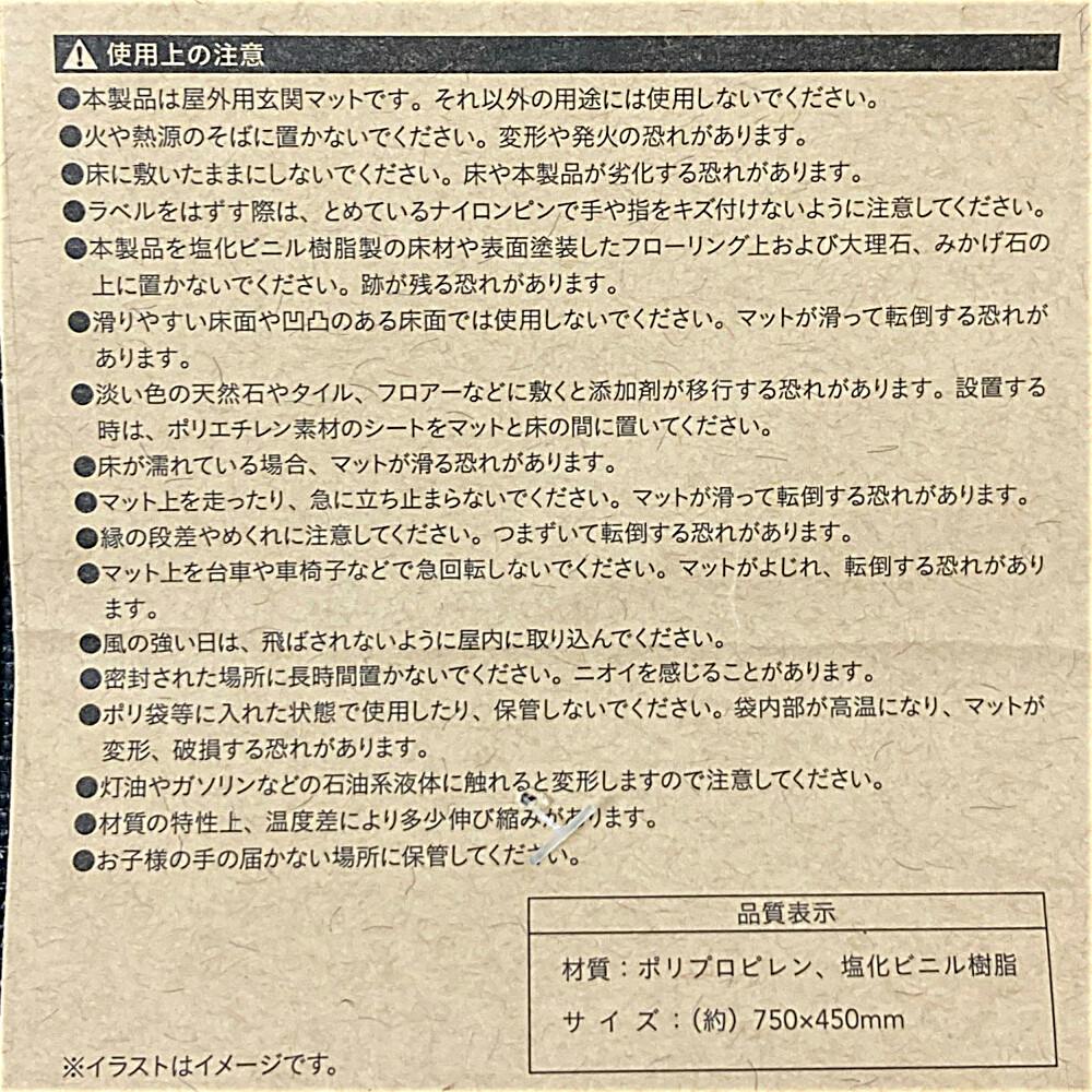 ●本製品は屋外用玄関マットです。それ以外の用途には使用しないでください。●火や熱源のそばに置かないでください。変形や発火の恐れがあります。