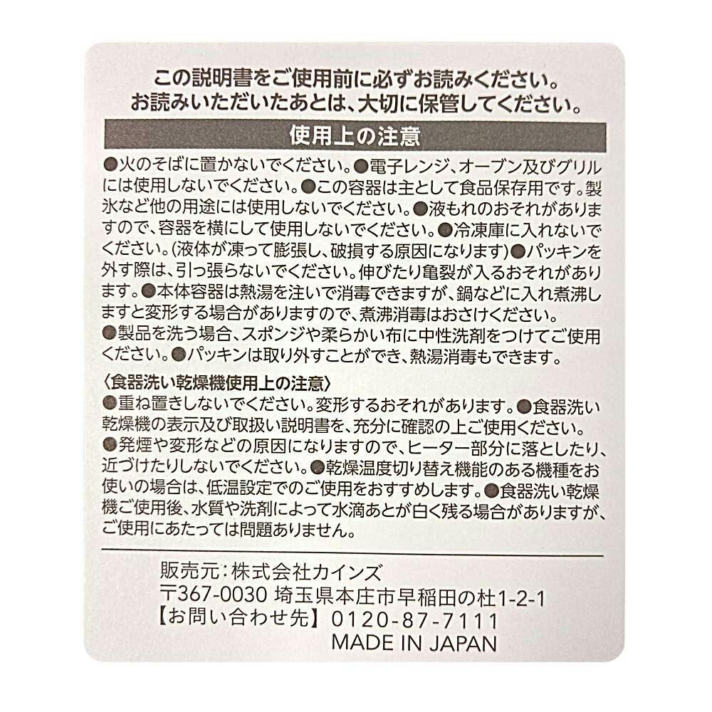 ●火のそばに置かないでください。●電子レンジ、オーブン及びグリルには使用しないでください。●この容器は主として食品保存用です。製氷など他の用途には使用しないでください。●液もれのおそれがありますので、容器を横にして使用しないでください。