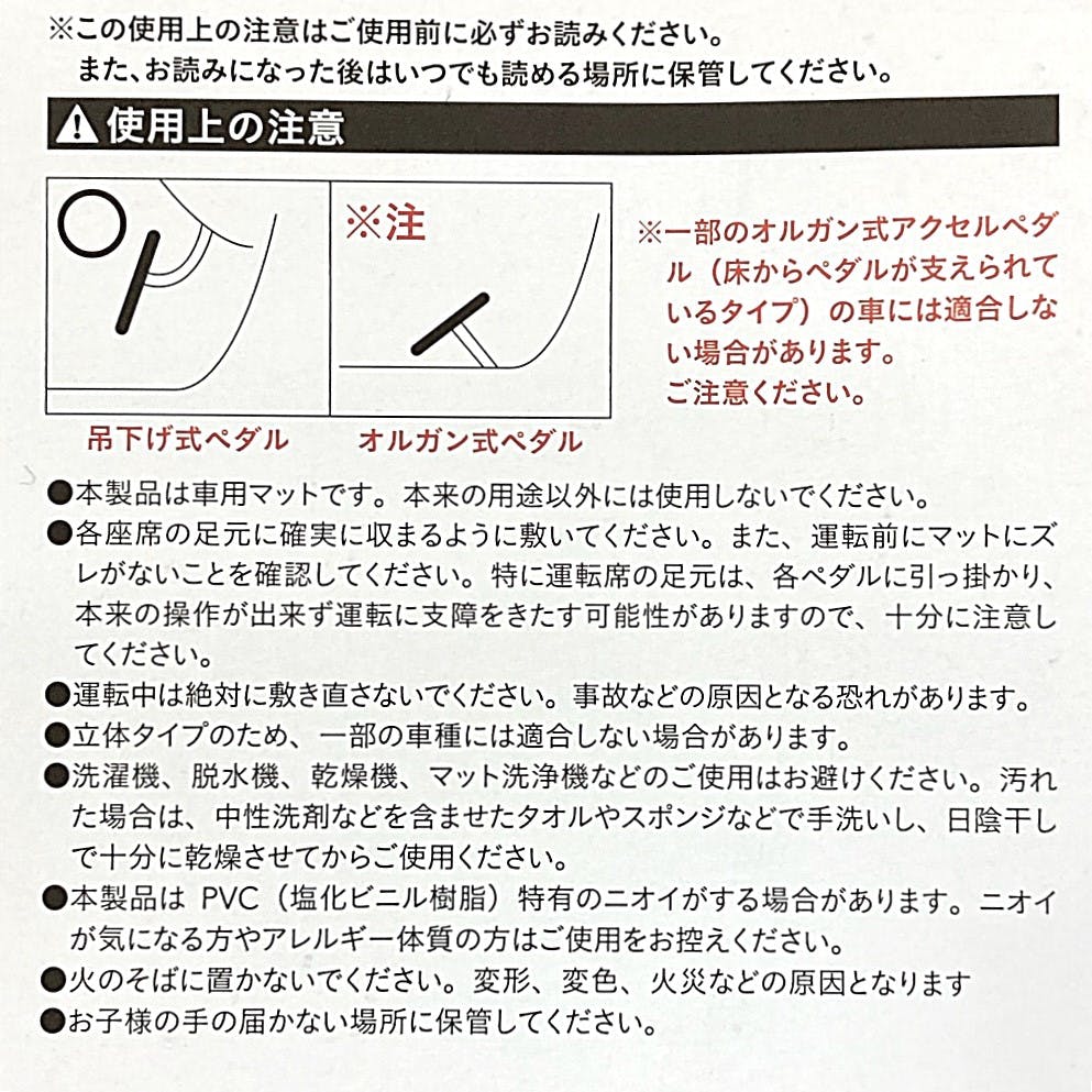 一部のオルガン式アクセルペダル(床からペダルが支えられているタイプ)の車には適合しない場合があります。ご注意ください。