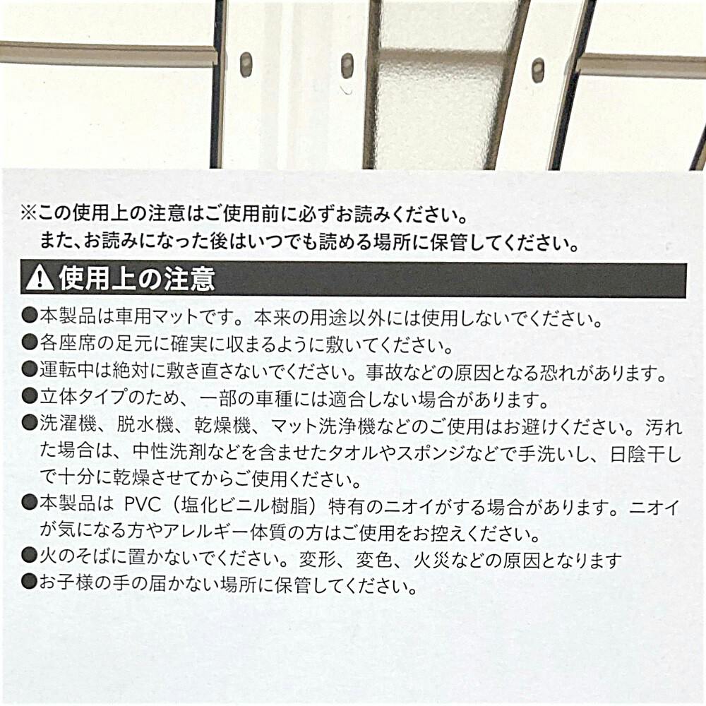 ●本製品は車用マットです。本来の用途以外には使用しないでください。●各座席の足元に確実に収まるように敷いてください。●運転中は絶対に敷き直さないでください。事故などの原因となる恐れがあります。