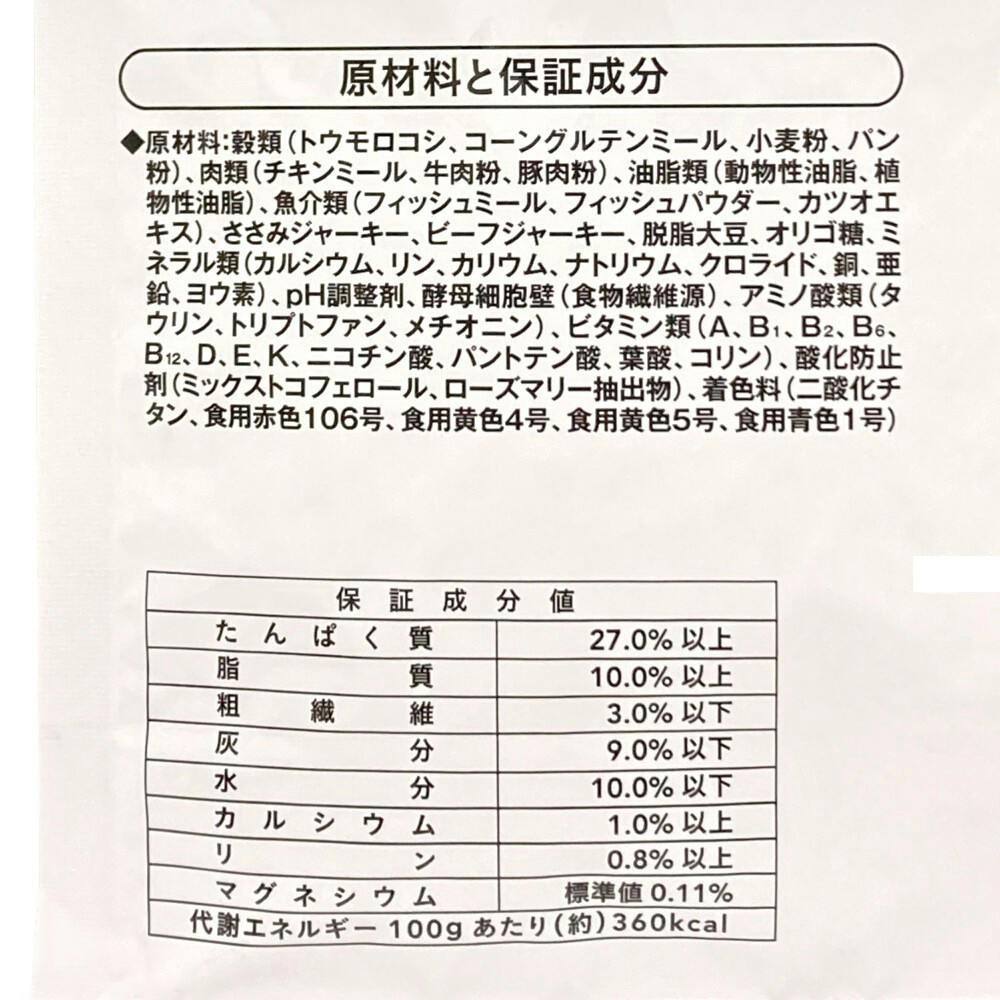 たんぱく質:27.0%以上、脂質:10.0%以上、粗繊維:3.0%以下、灰分:9.0%以下、水分:10.0%以下、カルシウム:1.0%以上、リン:0.8%以上、マグネシウム:標準値0.11%