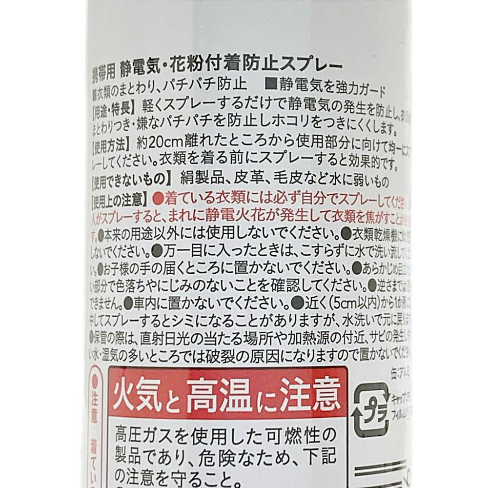●携帯用 ●静電気・花粉付着防止スプレー ●衣類の静電気を瞬時に除去。衣類にまとわりつきやイやなパチパチ防止。ホコリ・花粉の付着防止。