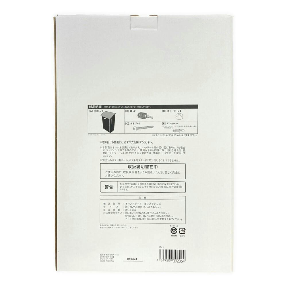 [A] ポスト×1、[B] 鍵×2、[C] 木ネジ×4、[D] スペーサー×4、[E] アンカー×4