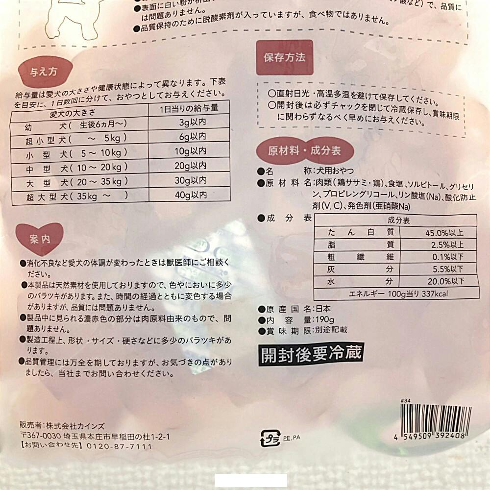 ●本製品は愛犬用おやつです。主食として与えないでください。●愛犬の食べ方や習性によっては、のどに詰まらせることがありますので、必ず観察しながらお与えください。等