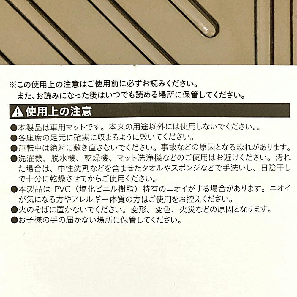 ●本製品は車用マットです。本来の用途以外には使用しないでください。●各座席の足元に確実に収まるように敷いてください。●運転中は絶対に敷き直さないでください。事故などの原因となる恐れがあります。