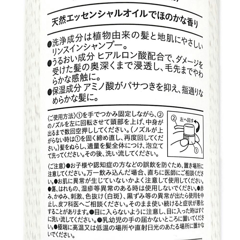 ●洗浄成分は植物由来の髪と地肌にやさしいリンスインシャンプー ●うるおい成分ヒアルロン酸配合で、ダメージを受けた髪の奥深くまで浸透し、毛先までやわらかな感触に ●保湿成分アミノ酸がパサつきを抑え、指通りなめらかな髪に ●無添加(無着色、無防腐剤)