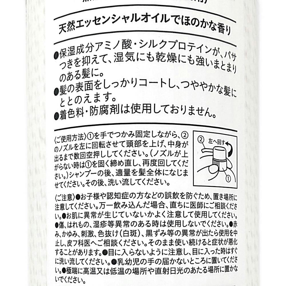 ●保湿成分アミノ酸・シルクプロテインが、パサつきを抑えて、湿気にも乾燥にも強いまとまりのある髪に ●髪の表面をしっかりコートし、つややかな髪にととのえます ●着色料・防腐剤は使用しておりません ●天然エッセンシャルオイルでほのかな香り