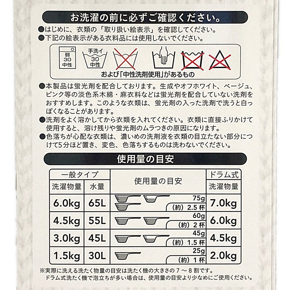 お洗濯の前に必ずご確認ください/●はじめに、衣類の「取扱い絵表示」を確認してください。●パッケージ記載の絵表示がある衣料品には使用しないでください。●本製品は蛍光剤を使用しております。など