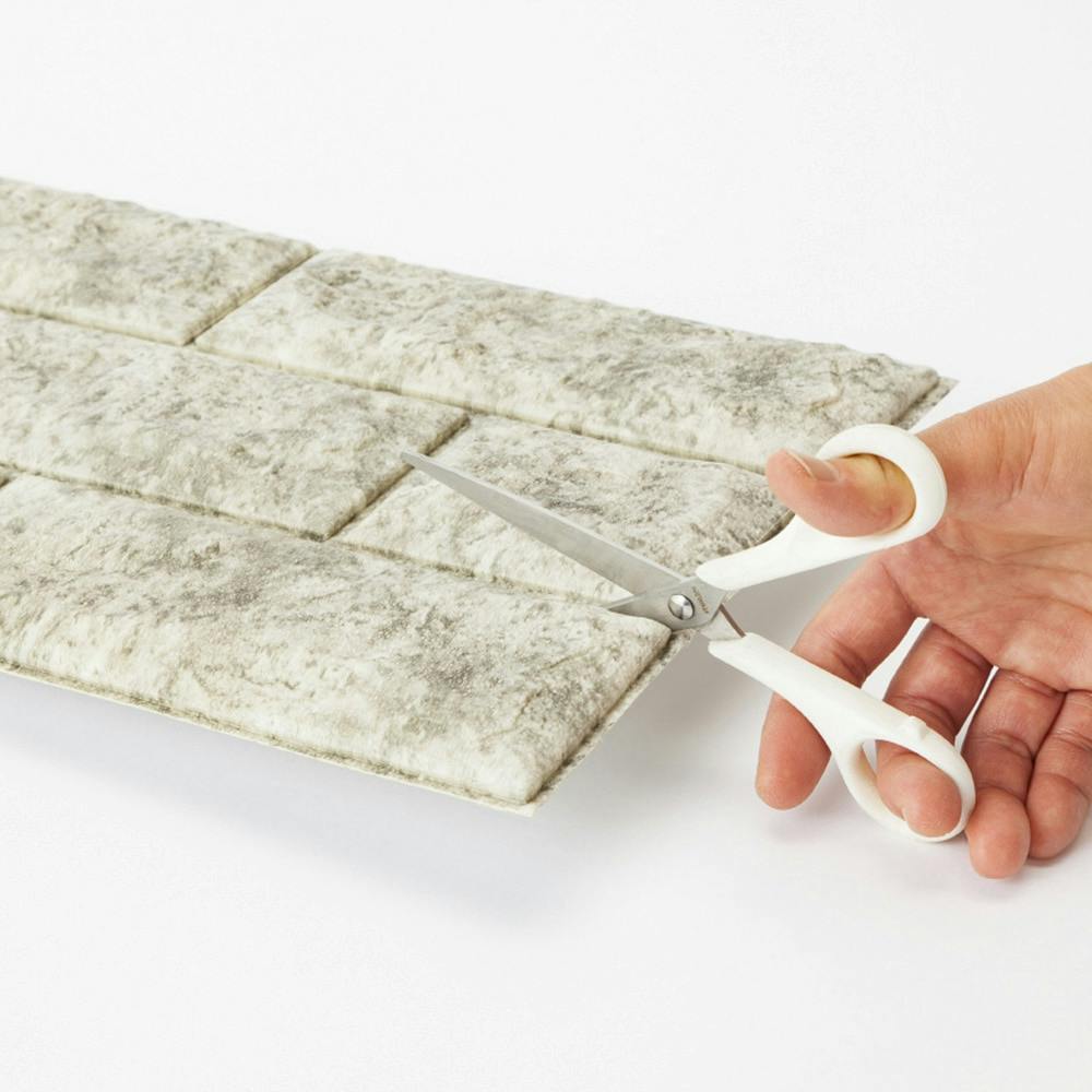 ①裏面の剥離台紙をはがします。②使用上の注意をよく読んでから、壁に貼ります。ハサミやカッターなどでお好みの大きさ・形に切って貼ることもできます。