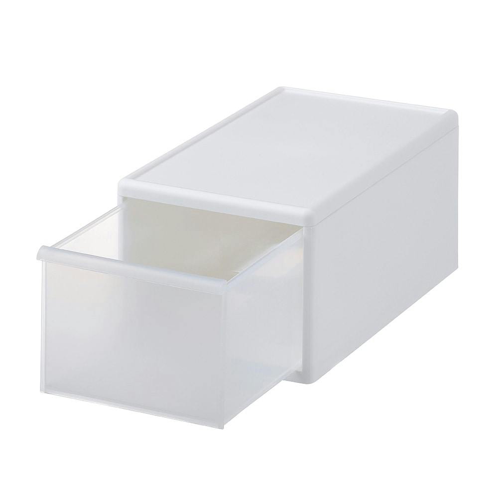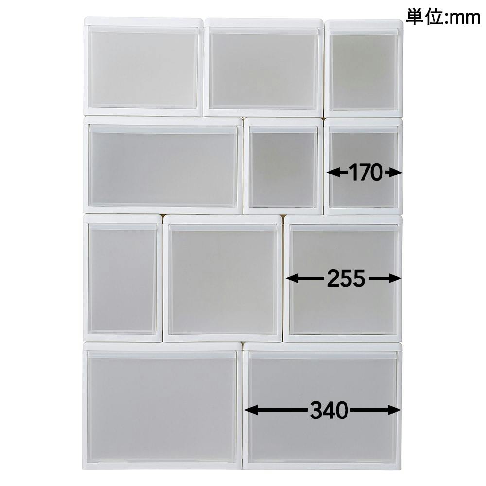 ●どのサイズでも奥行が同じだから、積み重ねるとピッタリ。溝がきっちりと重ねられる構造なので中身にあわせて幅の違うケースにしてもすっきり積み重ねられます。●どのサイズを重ねてもずれないから、階段状に積み重ねてスペースを無駄なく使うことができます。