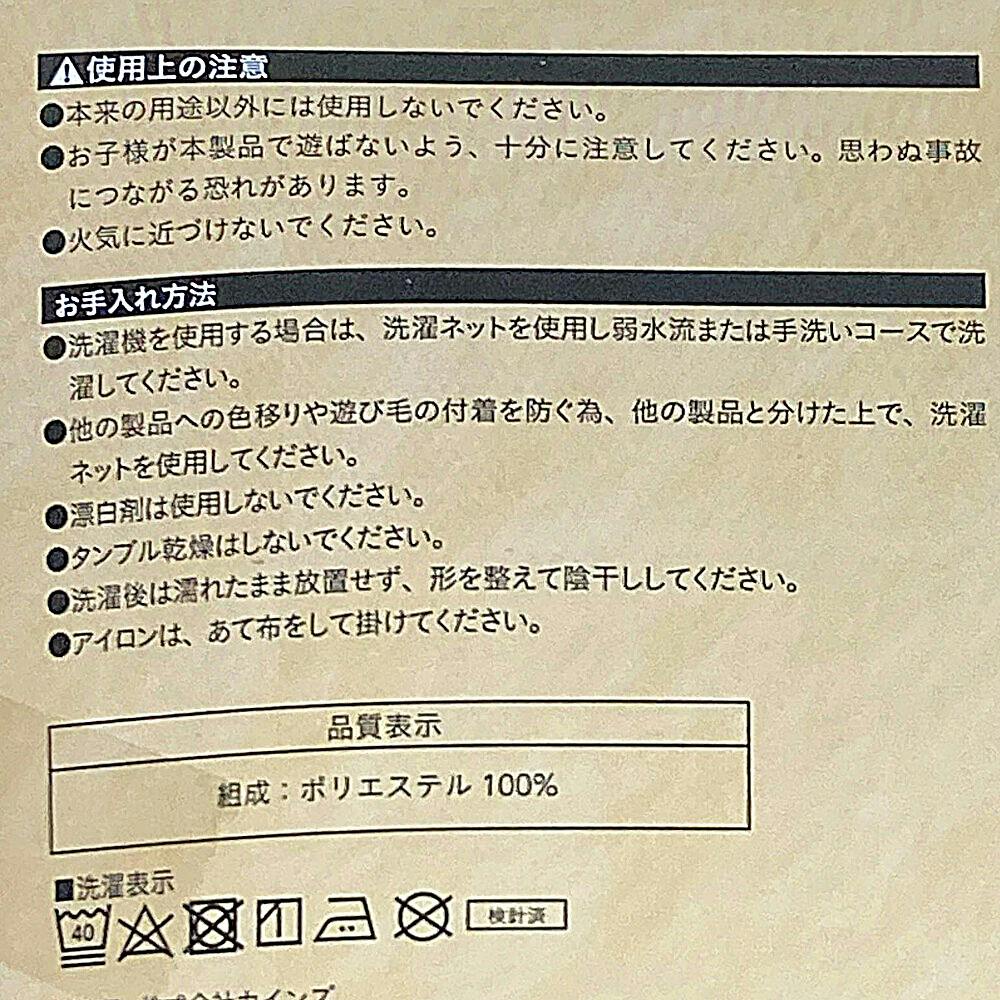 ●洗濯機を使用する場合は、洗濯ネットを使用し弱水流または手洗いコースで洗濯してください。●他の製品への色移りや遊び毛の付着を防ぐ為、他の製品と分けた上で、洗濯ネットを使用してください。●洗濯後は濡れたまま放置せず、形を整えて陰干ししてください。