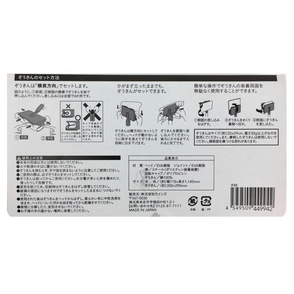 ●ヘッド/EVA樹脂 ●ジョイント/EVA樹脂 ●柄/スチール(ポリエチレン接着被膜) ●回転キャップ/ポリプロピレン ●ぞうきん/綿:100%
