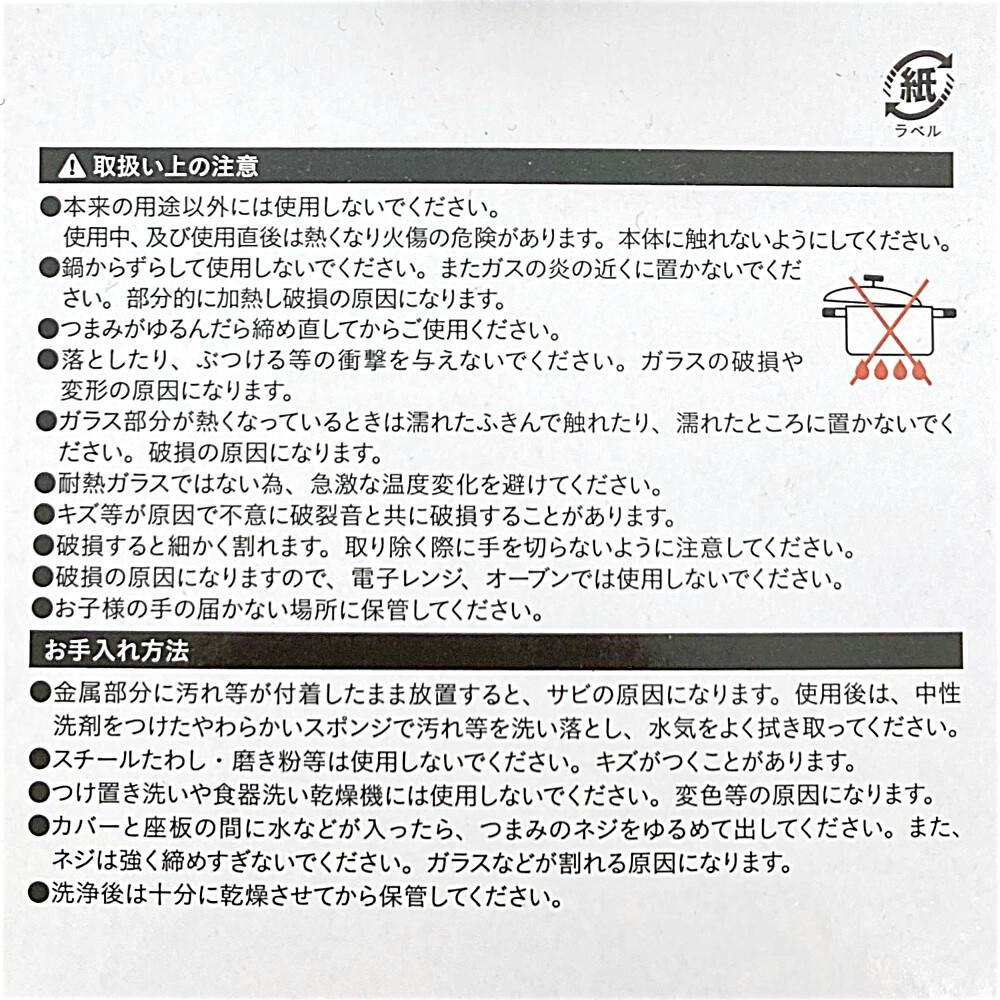 ●本来の用途以外でのご使用はおやめください。使用中、及び使用直後は熱くなり火傷の危険があります。触れないようにしてください。 ●鍋からずらして使用しないでください。またガスの炎の近くに置かないでください。部分的に加熱し変形・破損の原因になります。