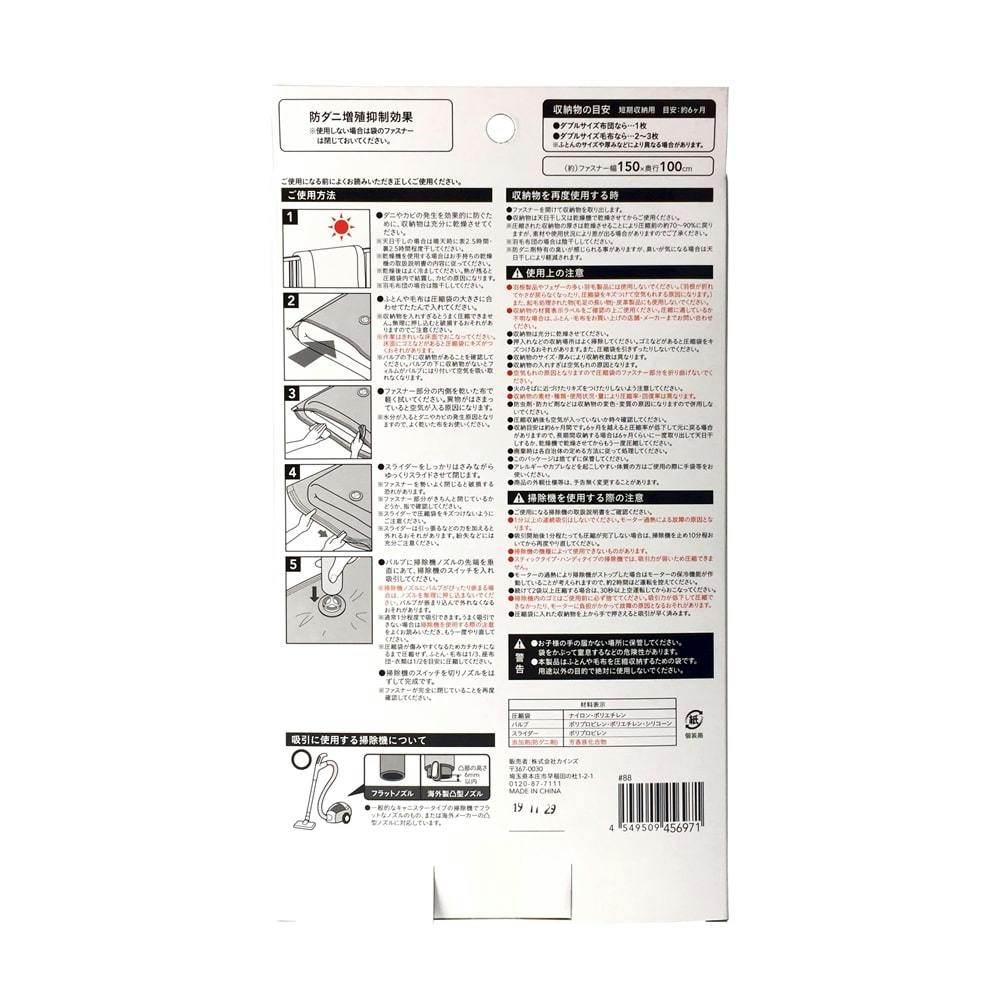 ●圧縮袋/ナイロン、ポリエチレン ●バルブ/ポリプロピレン、ポリエチレン、シリコーン ●スライダー/ポリプロピレン ●添加剤(防ダニ剤)/芳香族化合物