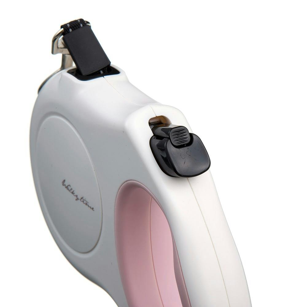 ①リードの伸縮を止めたい時はボタンを押してブレーキをかけてください。②ボタンを押した状態でロックを上にスライドさせると、リードの長さが完全に固定されます。固定を解除する場合はロックを下にスライドさせてください。