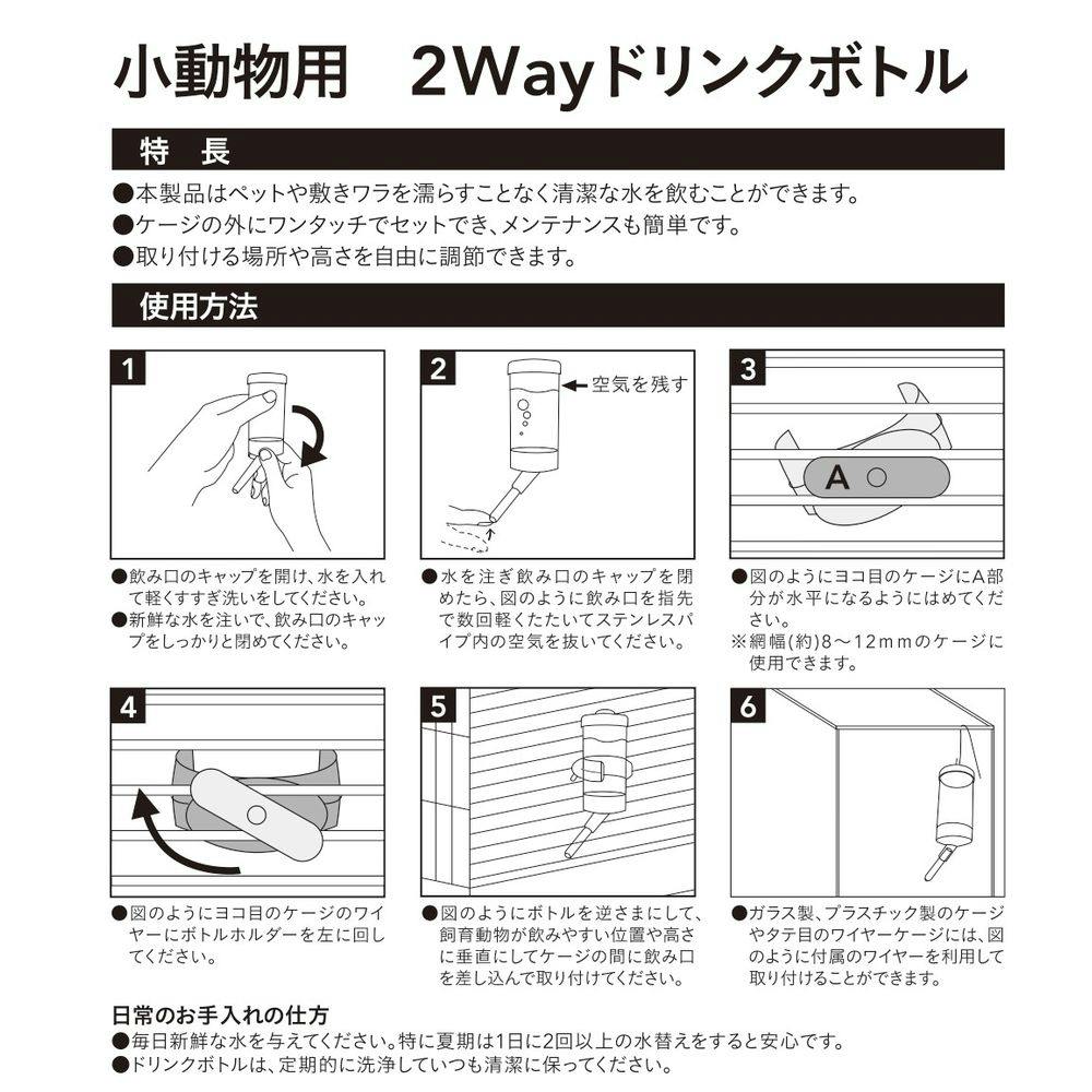 ●毎日新鮮な水を与えてください。特に夏期は1日に2回以上の水替えをすると安心です。●ドリンクボトルは、定期的に洗浄していつも清潔に保ってください。