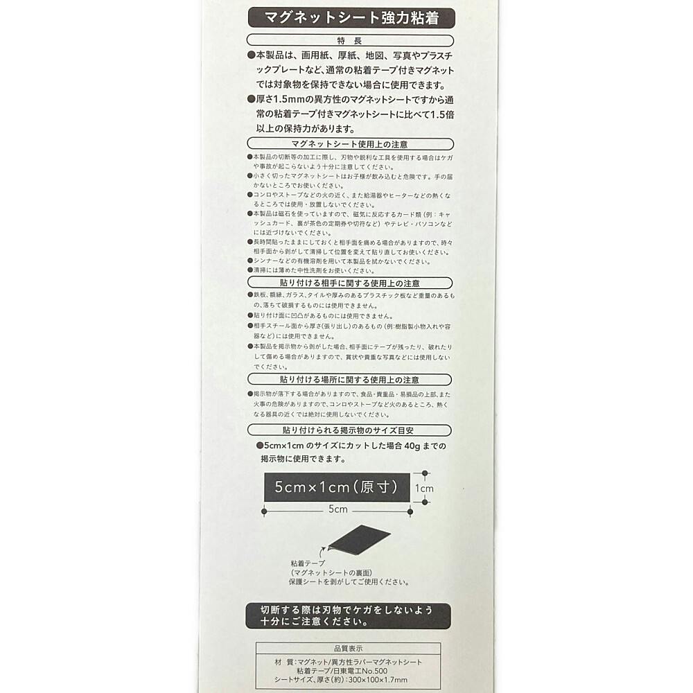 ●貼り付けられる掲示物のサイズ目安/5cm×1cmのサイズにカットした場合40gまでの掲示物に使用できます ●粘着テープ(マグネットシートの裏面)、保護シートを剥がしてご使用ください