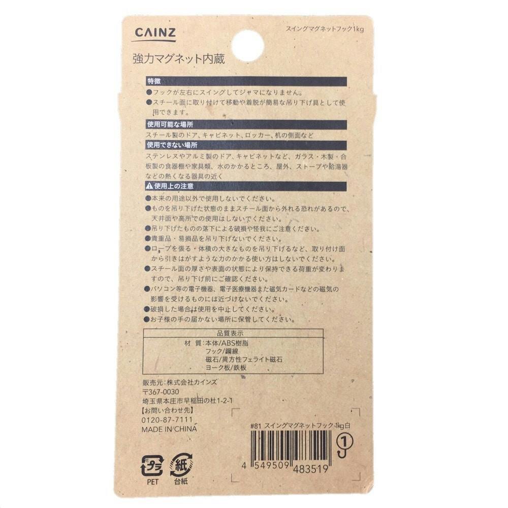●耐荷重:1kg ●使用可能な場所/スチール製のドア、キャビネット、ロッカー、机の側面など ●使用できない場所/ステンレスやアルミ製のドア、キャビネットなど、ガラス・木製・合板製の食器棚や家具類、水のかかるところ、屋外、ストーブや給湯器などの熱くなる器具の近く