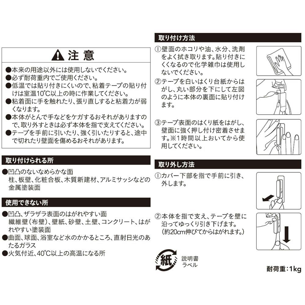 使用できない所/●凹凸、ザラザラ表面のはがれやすい面、繊維壁(布壁)、壁紙、砂壁、土壁、コンクリート、はがされやすい塗装面 ●曲面、球面、浴室など水のかかるところ、直射日光のあたるガラス ●火気付近、40度以上の高温になる所
