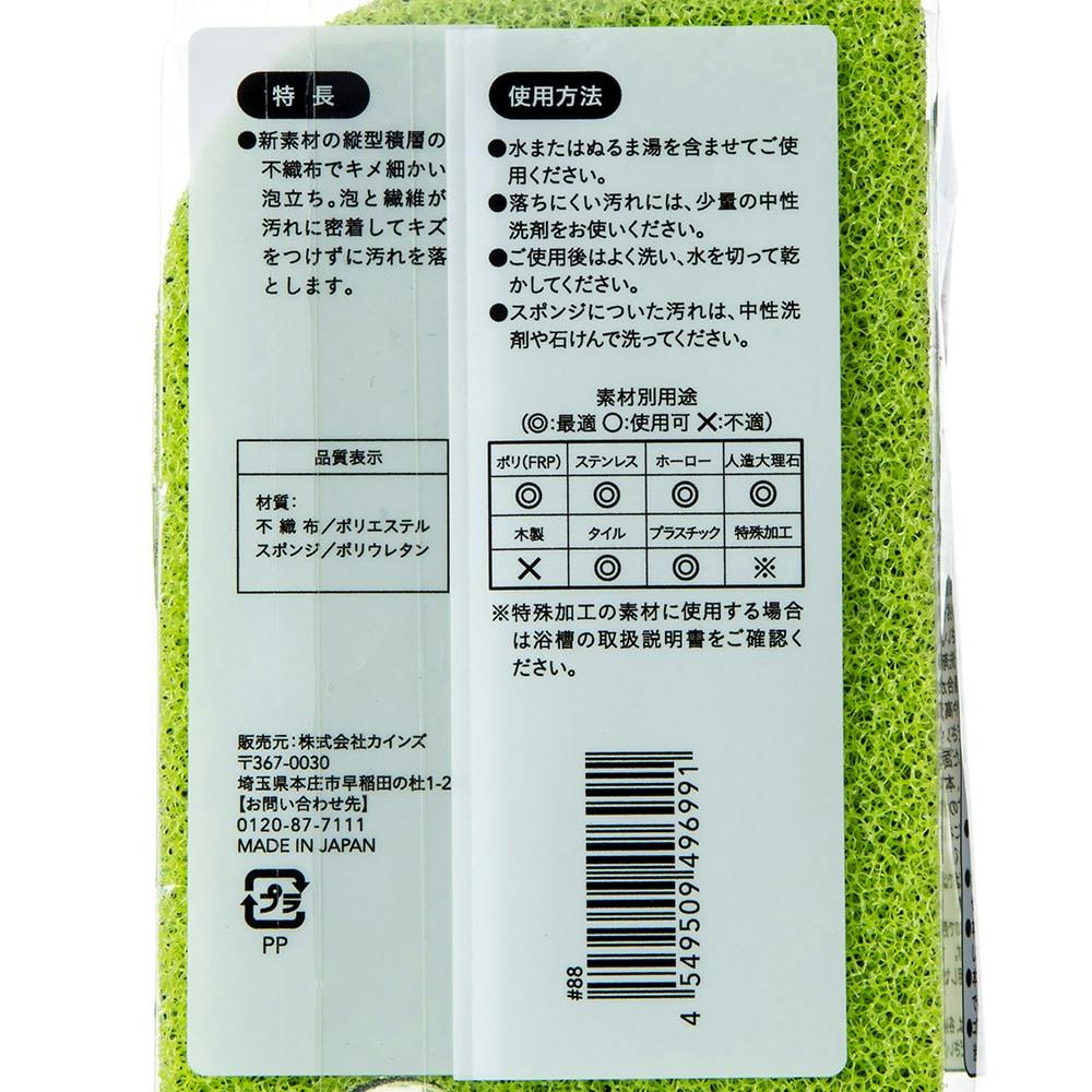 ●新素材の縦型積層の不織布でキメ細かい泡立ち。泡と繊維が汚れに密着してキズをつけずに汚れを落とします。●やわらかく曲げやすいので浴槽の曲面も洗いやすい。●4層構造スポンジで、タオルバーに吊るせる形状 ●やわらかめ など