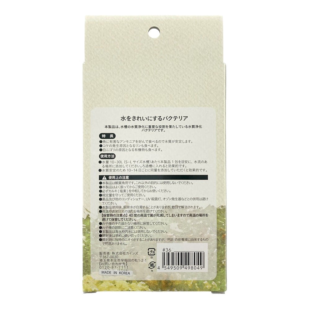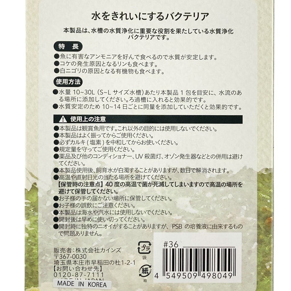 ●水量10~30L(S~Lサイズ水槽)あたり本製品1包を目安に、水流のある場所に添加してください。ろ過槽に入れると効果的です。●水質安定のため10~14日ごとに同量を添加していただくと効果的です。