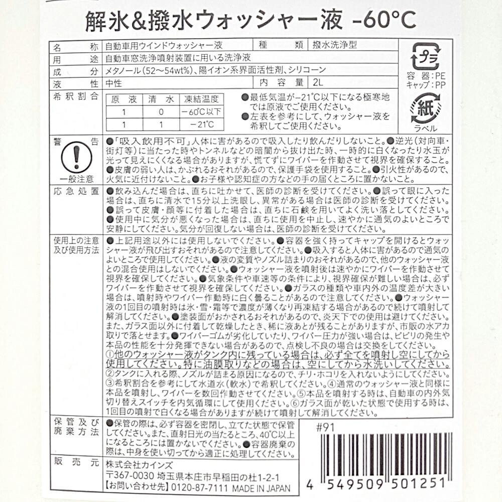 カインズ 解氷 ウオッシャー液 &撥水 2L