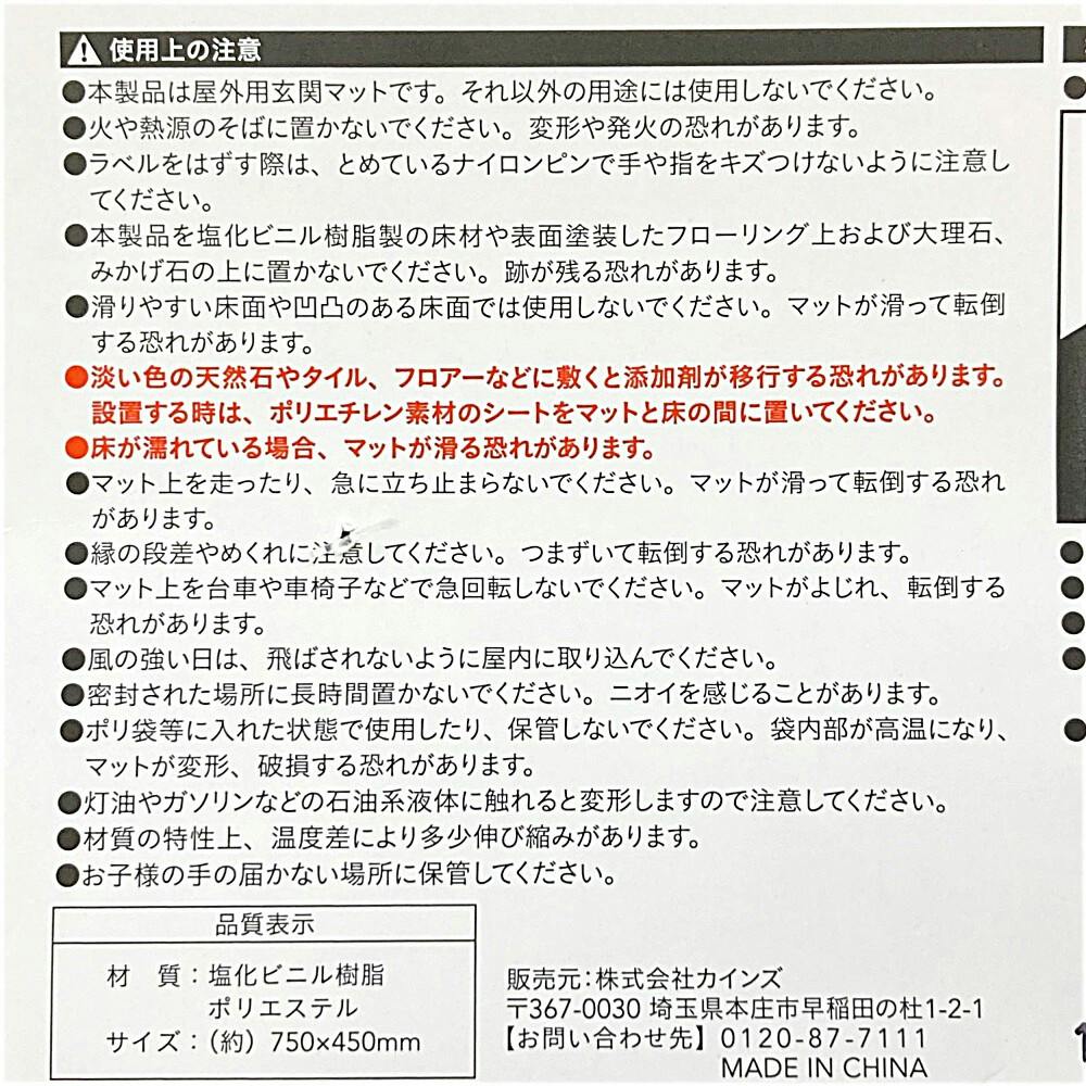 ●本製品は屋外用玄関マットです。それ以外の用途には使用しないでください。●火や熱源のそばに置かないでください。変形や発火の恐れがあります。