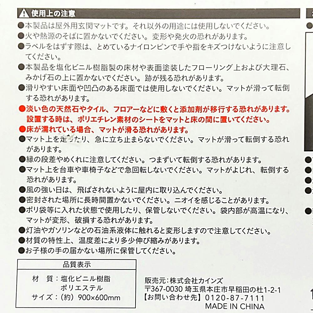 ●本製品は屋外用玄関マットです。それ以外の用途には使用しないでください。●火や熱源のそばに置かないでください。変形や発火の恐れがあります。