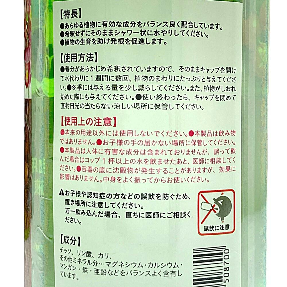●あらゆる植物に有効な成分をバランス良く配合しています。●希釈せずにそのままシャワー状に水やりしてください。●植物の生育を助け発根を促進します。