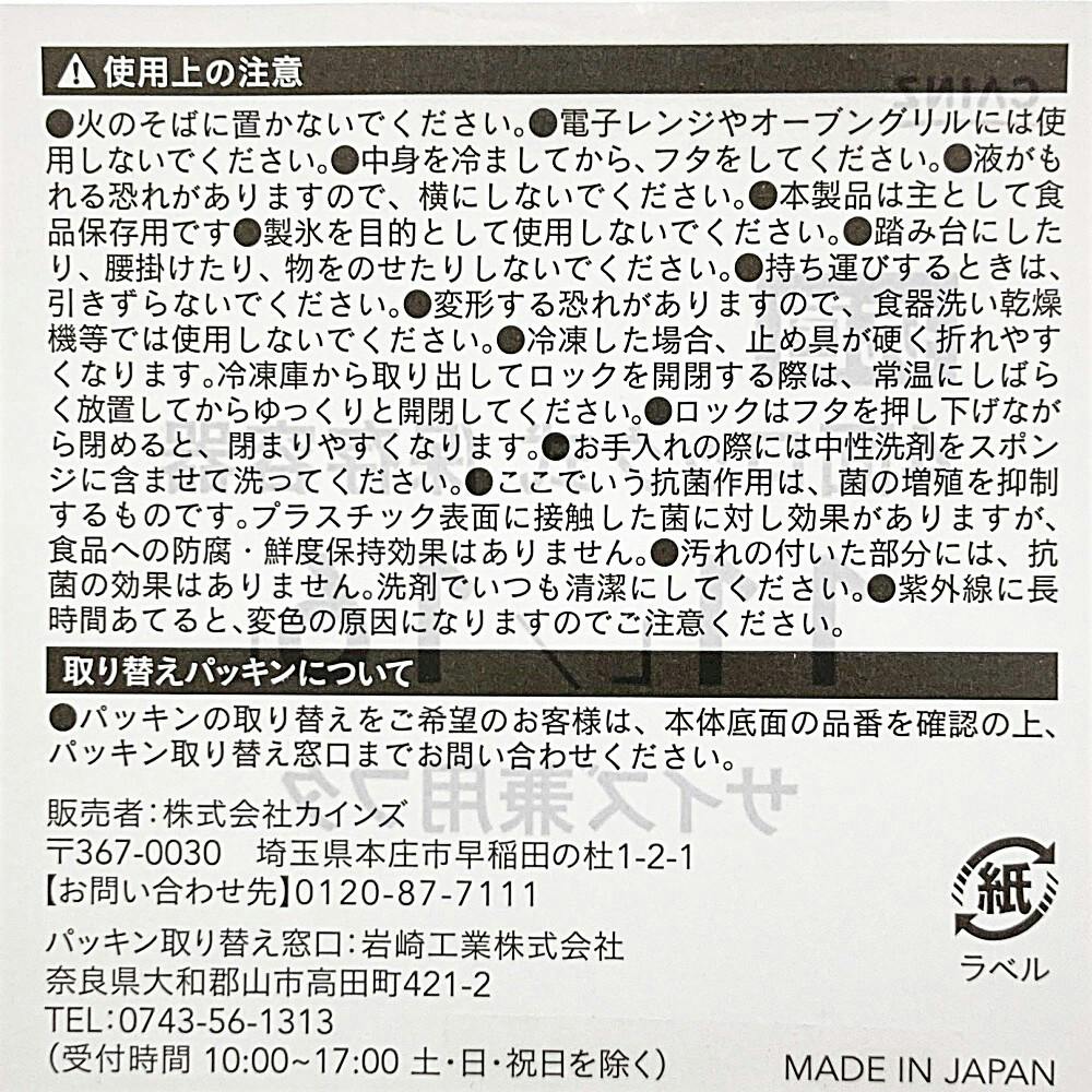 ●火のそばに置かないでください。●電子レンジやオーブングリルには使用しないでください。●中身を冷ましてから、フタをしてください。●液がもれる恐れがありますので、横にしないでください。●本製品は主として食品保存用です。●製氷を目的として使用しないでください。