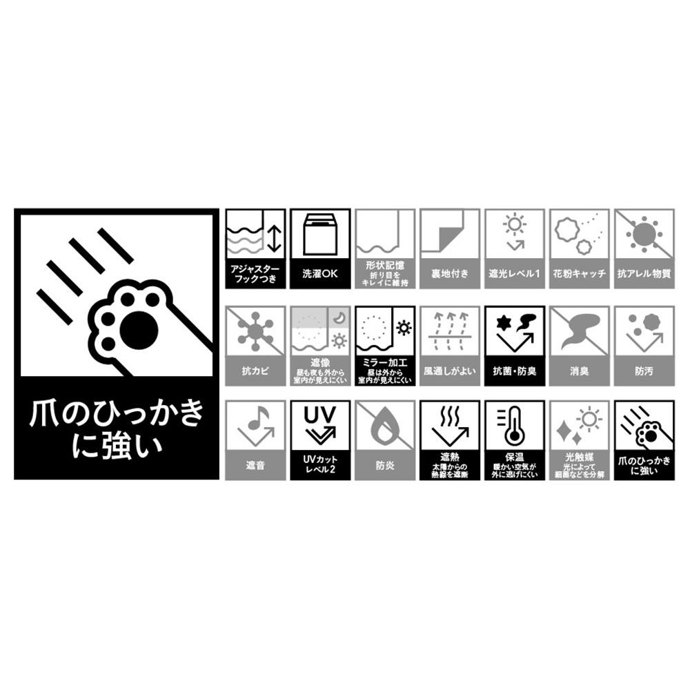 ●ミラー加工/昼は外から室内が見えにくい●UV:79.8%カット/生地の表面で紫外線を吸収、拡散●遮熱/断熱性が高く冷暖房代が節約、省エネ●保温/開口部からの熱の流出を防ぐ●洗濯機OK