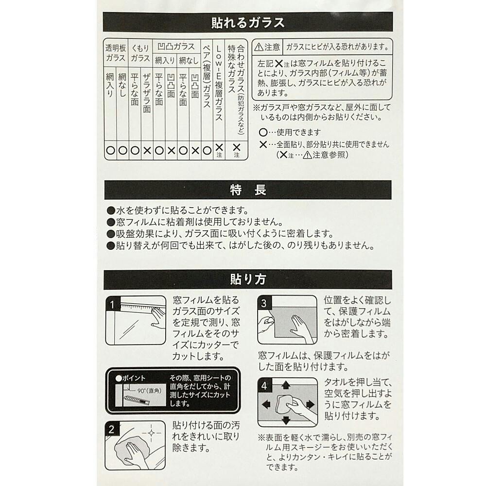 ●ガラス戸や窓ガラスなど、屋外に面しているものは、内側からお貼りください。●室温及び、貼り付ける面が約5℃以下、35℃以上の場合での貼り付け作業はお避けください。●水が直接かかる浴室内のガラス戸などにはご使用出来ません。など