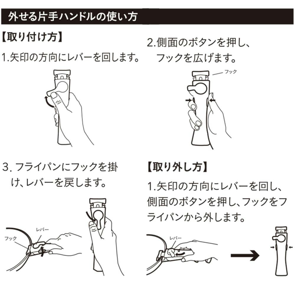 ●本来の用途以外には使用しないでください。 ●「取っ手が外せるストーンマーブル」シリーズのフライパン、鍋以外への使用は絶対にしないでください。 ●ハンドル使用時は本体に確実にセットされていることを確認してから使用してください。