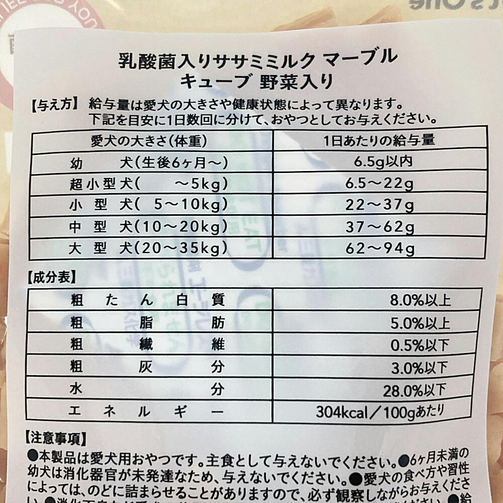 肉類(鶏肉、鶏ササミ)、小麦粉、にんじん、ほうれん草、ソルビトール、グリセリン、コーンスターチ、ホエイパウダー、保存料(ソルビン酸K)、リン酸塩、香料、着色料(酸化チタン、β-カロテン、赤106号、青1号)、乳酸菌