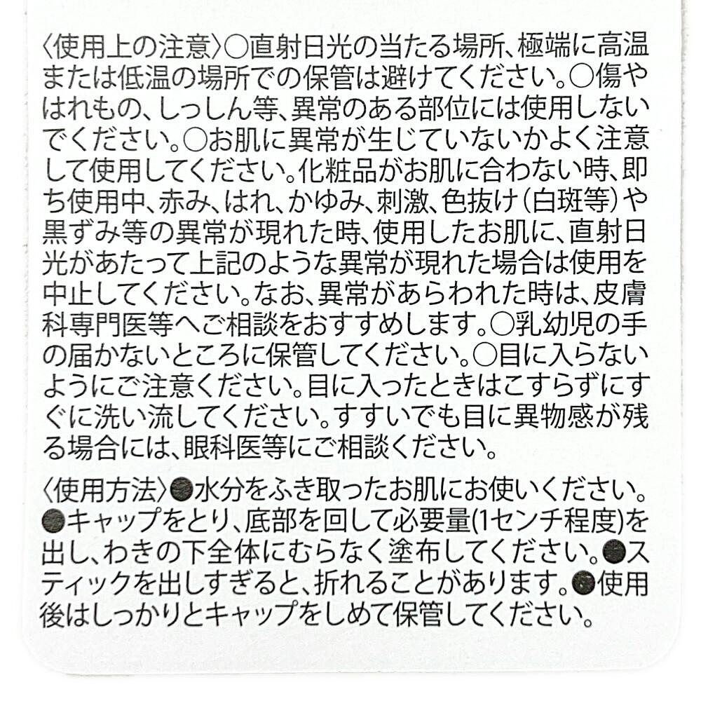 ●水分をふき取ったお肌にお使いください ●キャップをとり、底部を回して必要量(1センチ程度)を出し、わきの下全体にむらなく塗布してください ●スティックを出しすぎると、折れることがあります ●使用後はしっかりとキャップをしめて保管してください