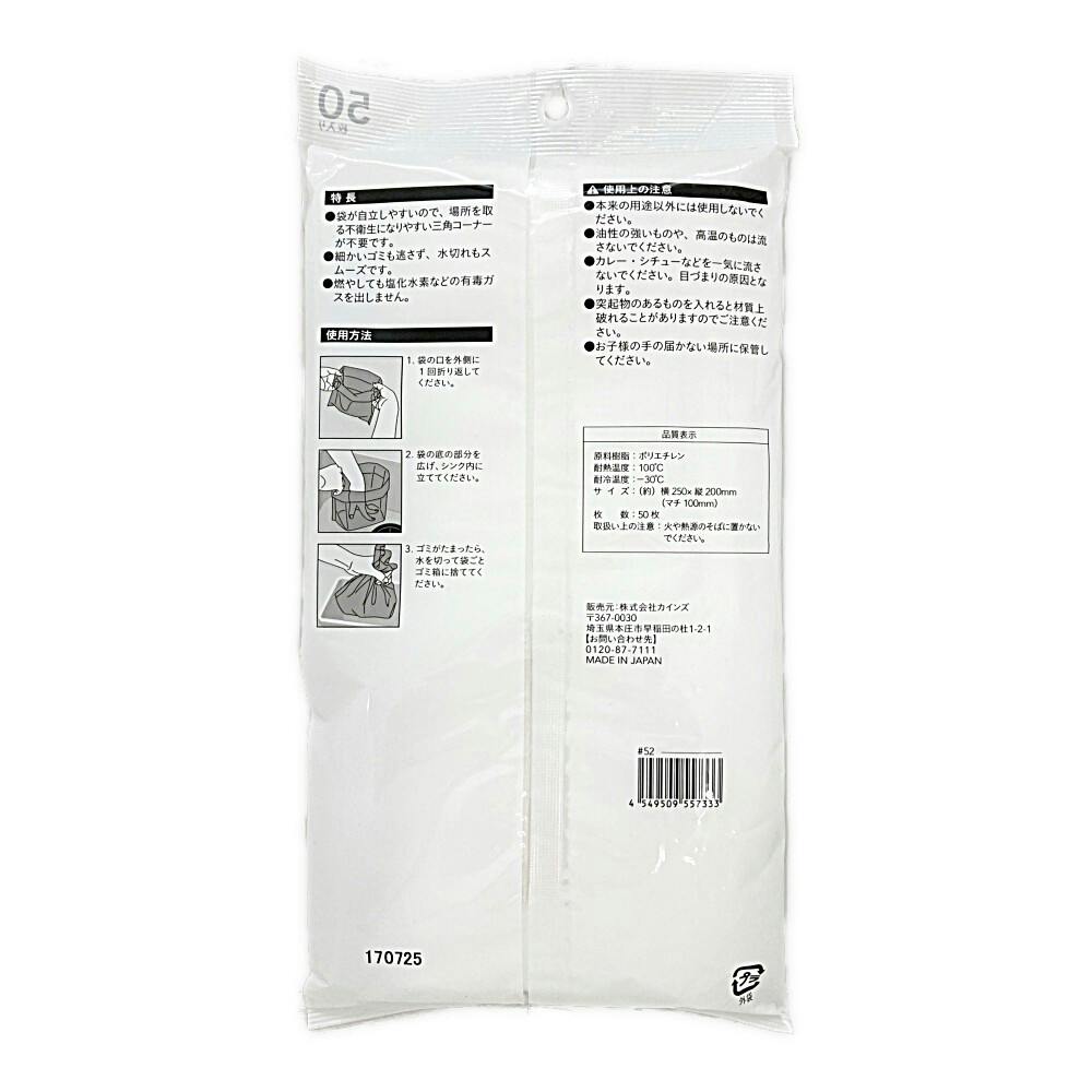 ●袋が自立しやすいので、場所を取る不衛生になりやすい三角コーナーが不要です。●細かいゴミも逃さず、水切れもスムーズです。●燃やしても塩化水素などの有毒ガスを出しません。