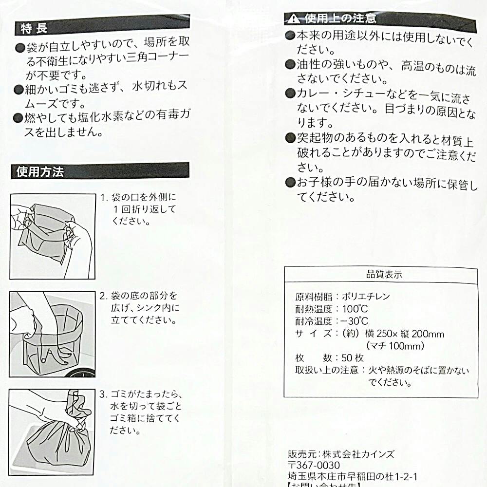 1.袋の口を外側に1回折り返してください。2.袋の底の部分を広げ、シンク内に立ててください。3.ゴミがたまったら、水を切って袋ごとゴミ箱に捨ててください。