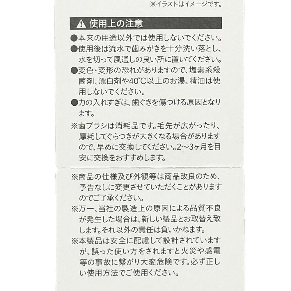 ●本来の用途以外では使用しないでください。●使用後は流水で歯みがきを十分洗い落とし、水を切って風通しの良い所に置いてください。●変色・変形の恐れがありますので、塩素系殺菌剤、漂白剤や40℃以上のお湯、精油は使用しないでください。